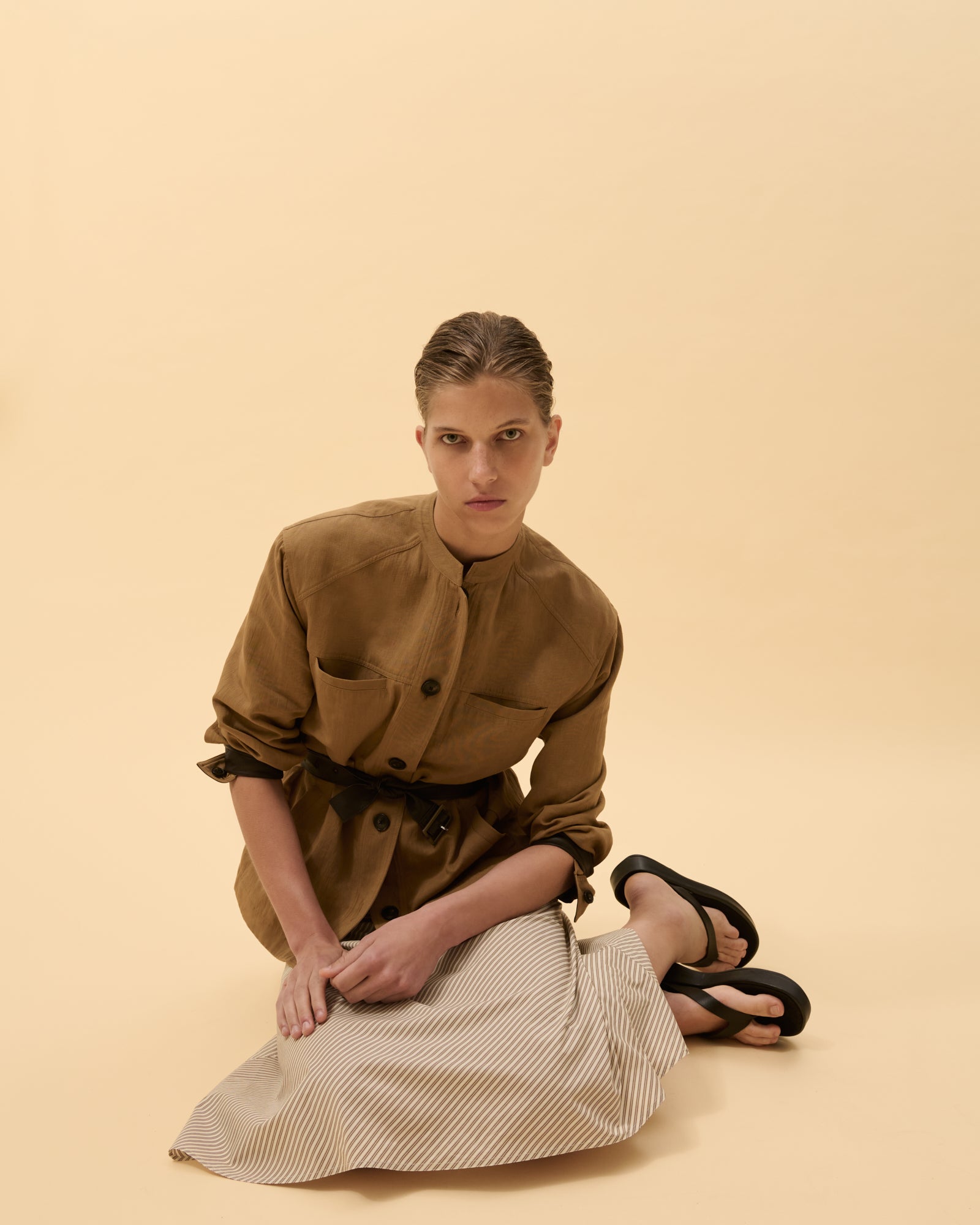 Made of leather, suede or cotton linen fabric, this four-pocket belted jacket stands out as a timeless classic and a versatile wardrobe must. Wear it with a dress and boots for a formal look, or with boyfriend trousers for a nonchalantly chic everyday outfit.