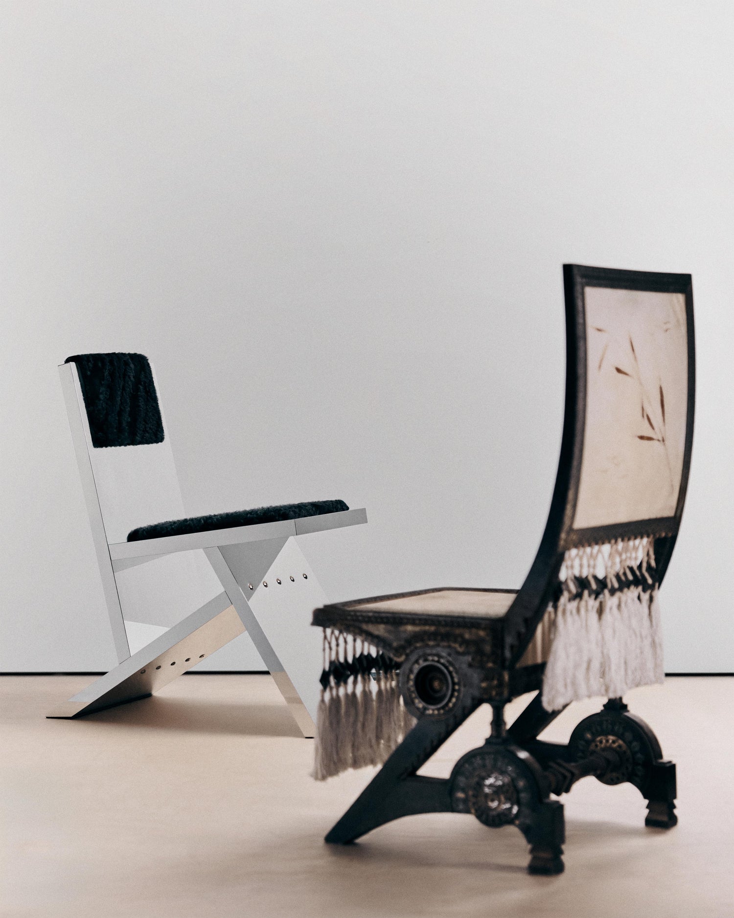 After first partnering with Chapo Créations in 2024, Yves Salomon Éditions kickstarts a new adventure with an ensemble of pieces created with Dimorestudio, freely echoing the works of Carlo Bugatti. It all began with an encounter over a shared passion. A year ago, Yves Salomon and Tamara Taichman, the Artistic Director of the House, both of them design enthusiasts and collectors, met Britt Moran and Emiliano Salci, founders of Dimorestudio. A creative spark was ignited from the get go, and an aesthetic affinity soon led to a desire to develop a project together. After discovering a common curiosity for Carlo Bugatti’s sculptural furnishings and unique pieces blending carpentry and parchment, they set on the idea of designing a collection of contemporary creations, conceived as an open dialogue with the Italian master’s style vocabulary.