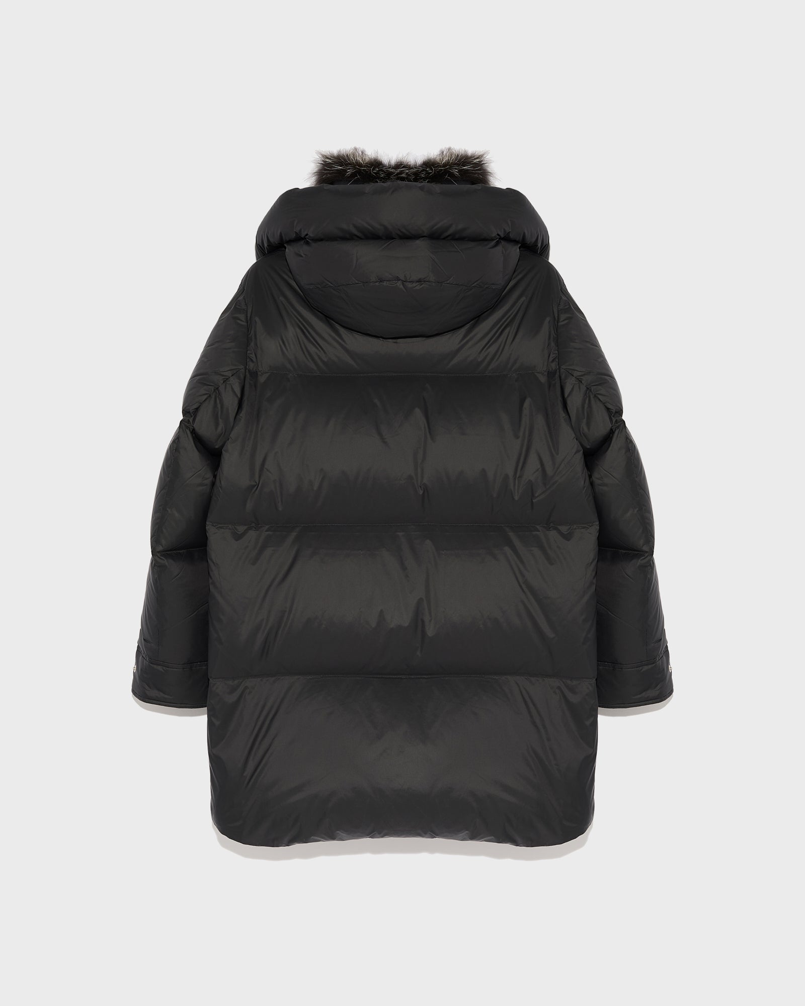 Crafted from water-repellent technical fabric, this lightweight down jacket is padded with high-quality down and duck feathers to guarantee comfort, warmth and breathability. Design details include a front zip and press-stud fastening, two patch pockets with flaps, cuffs with tightening tabs, as well as invisible ribbed finishes at the bottom sleeves. The side slits with press-stud closure add ease and modernity. Featuring a detachable hood and a removable collar trim in fox fur, this down jacket is versatile and timeless.
