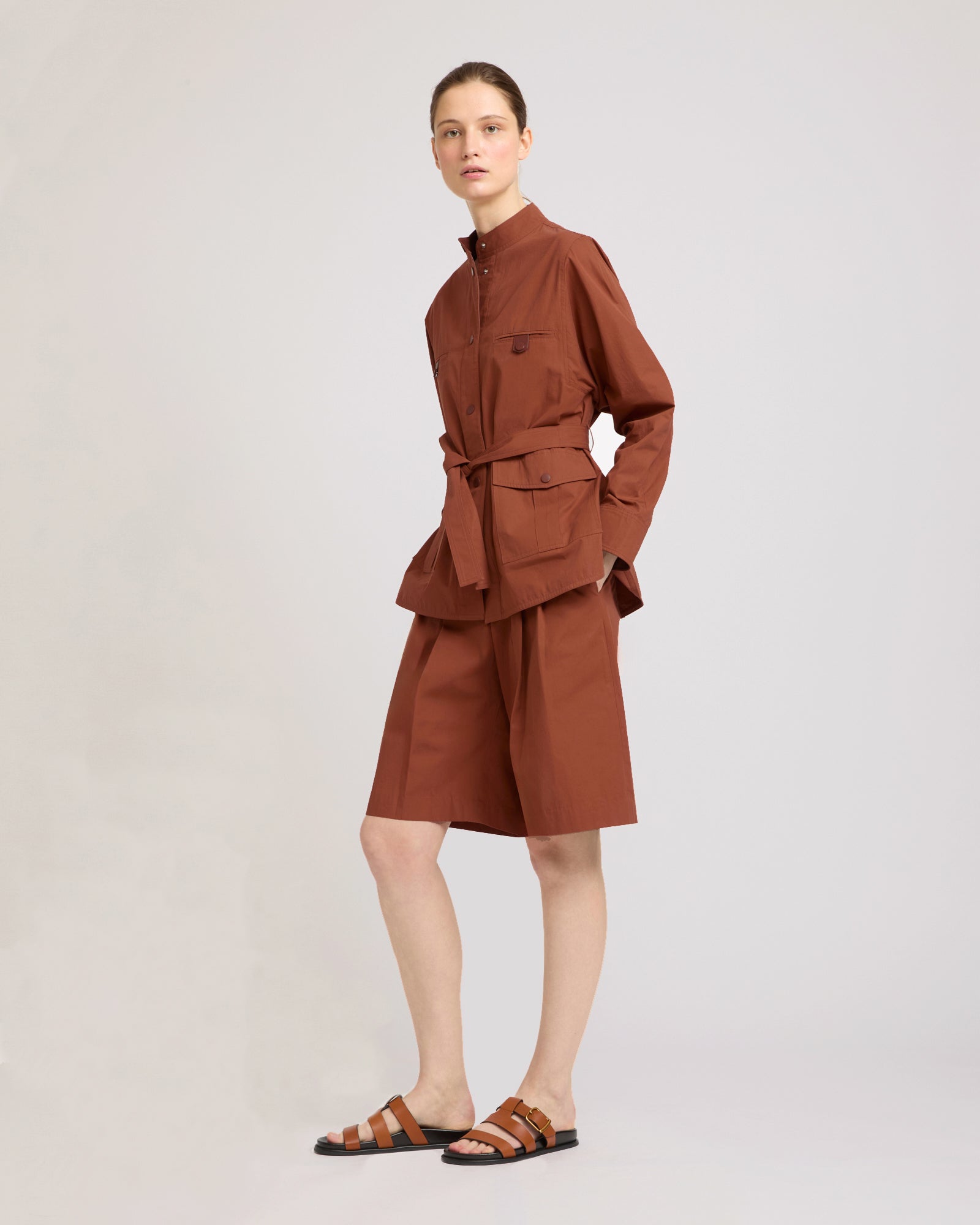A safari-style jacket in flowing cotton, to be worn belted in order to highlight a clever play of pleats at the back. Details in lambskin leather on the pockets, collar, cuffs and buttons add an extra elegance to this statement piece.