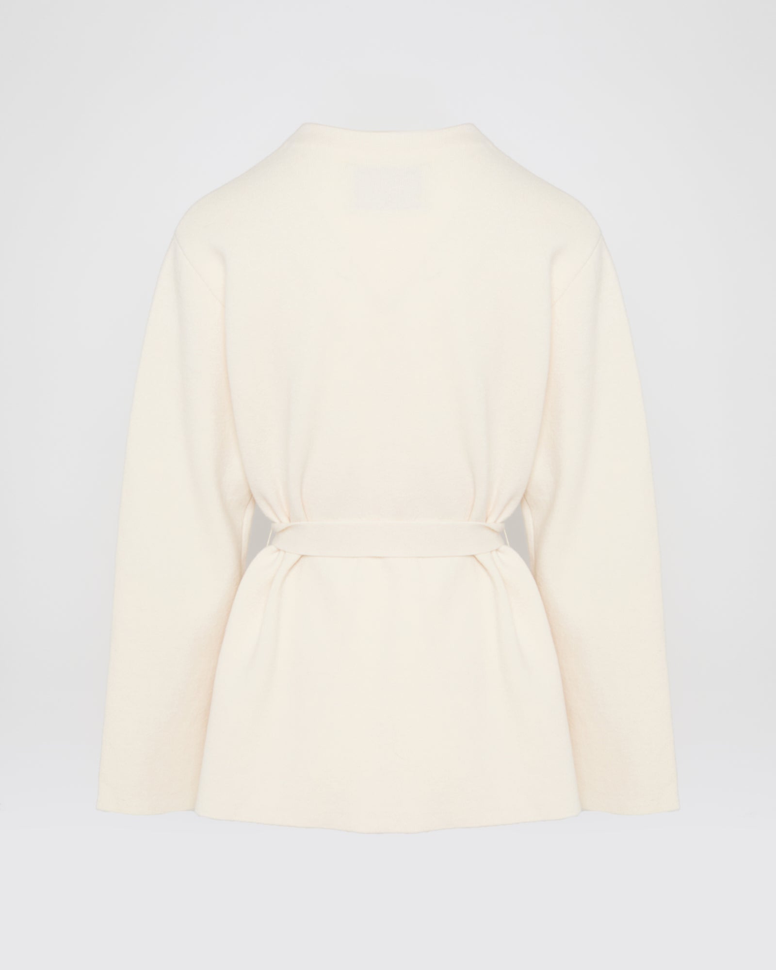 Providing a fluid, elegant silhouette, this collarless belted jacket opts for the perfect hang of a knit / mink association. Two large front pockets welcome the hands to finish off a look that this sophisticated yet relaxed.