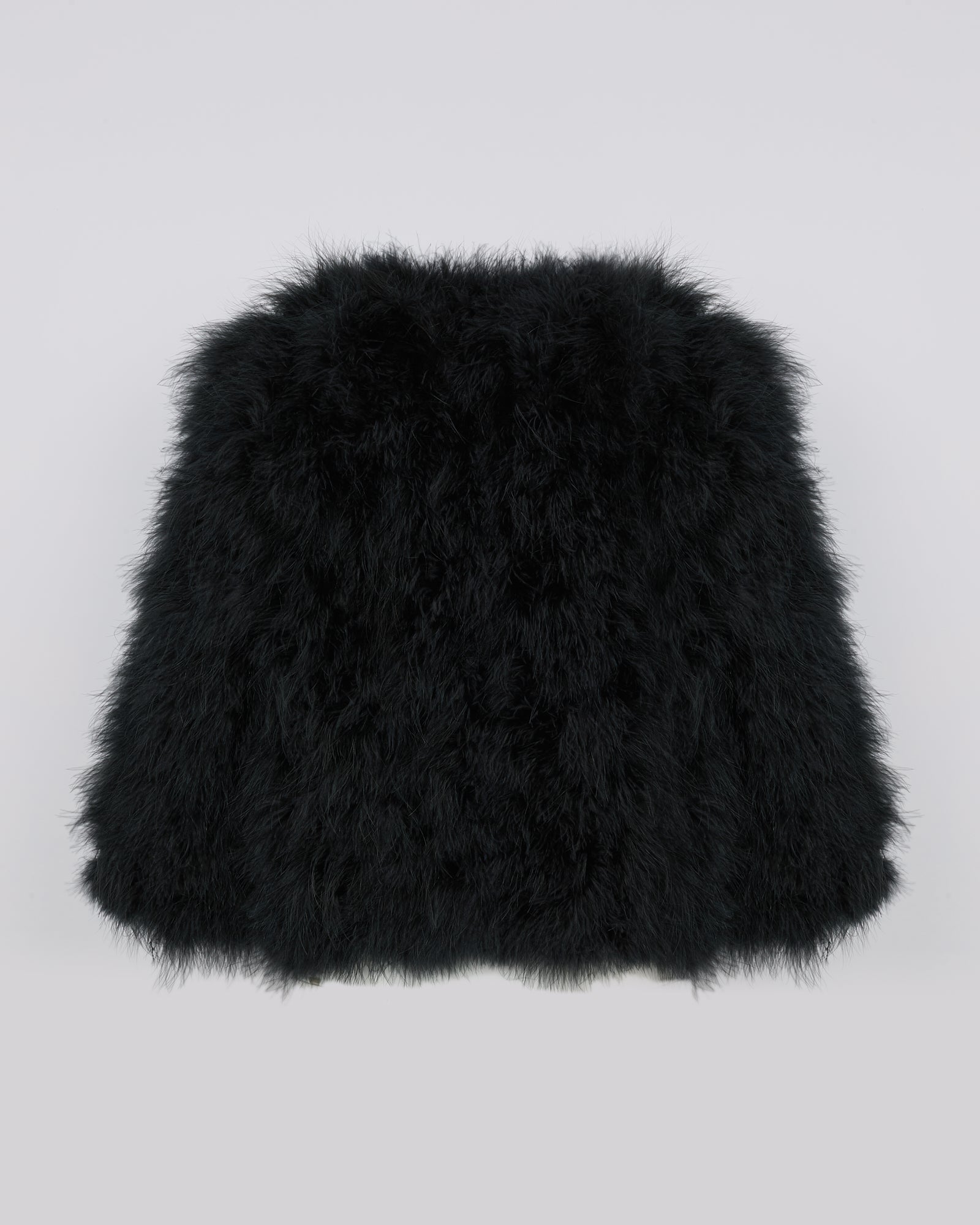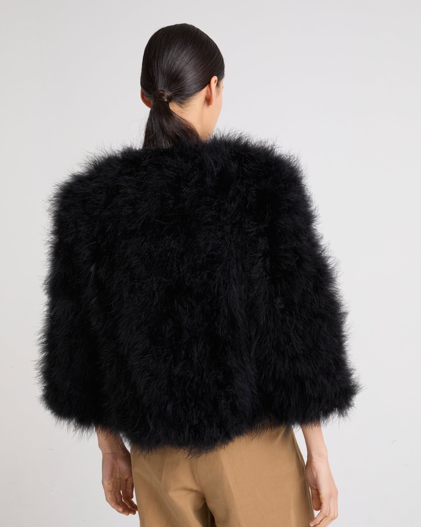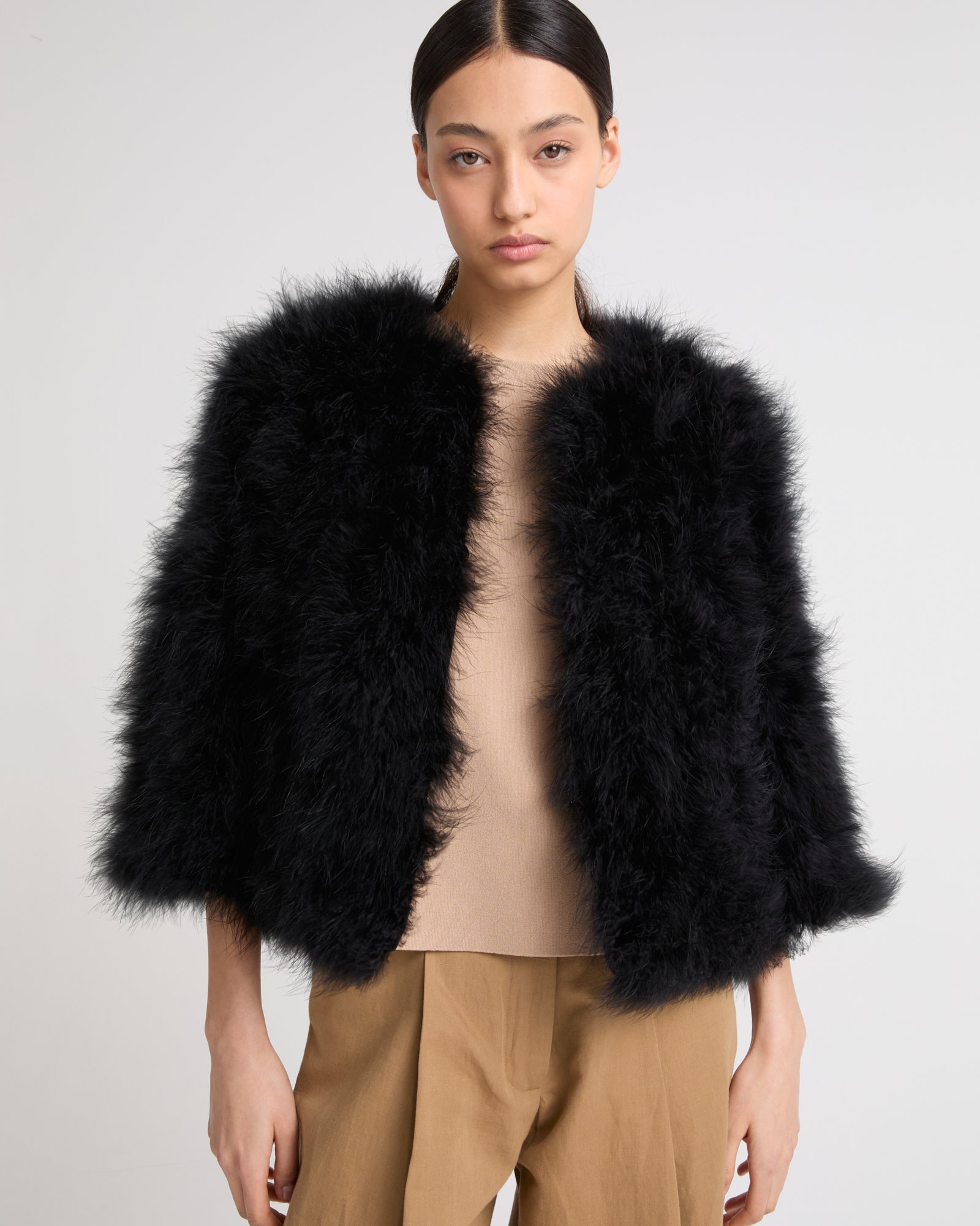 A modern interpretation of the feather jacket for a unique yet versatile style. The contemporary fit and minimalist design details include a rounded neckline, ¾ sleeves, a cropped cut and a hook-and-eye fastening for a pared back silhouette. Comfortable and breathable, the lining is in silk. A lightweight and airy jacket to mix and match easily with the other pieces of the collection for a sophisticated look or a more casual one.