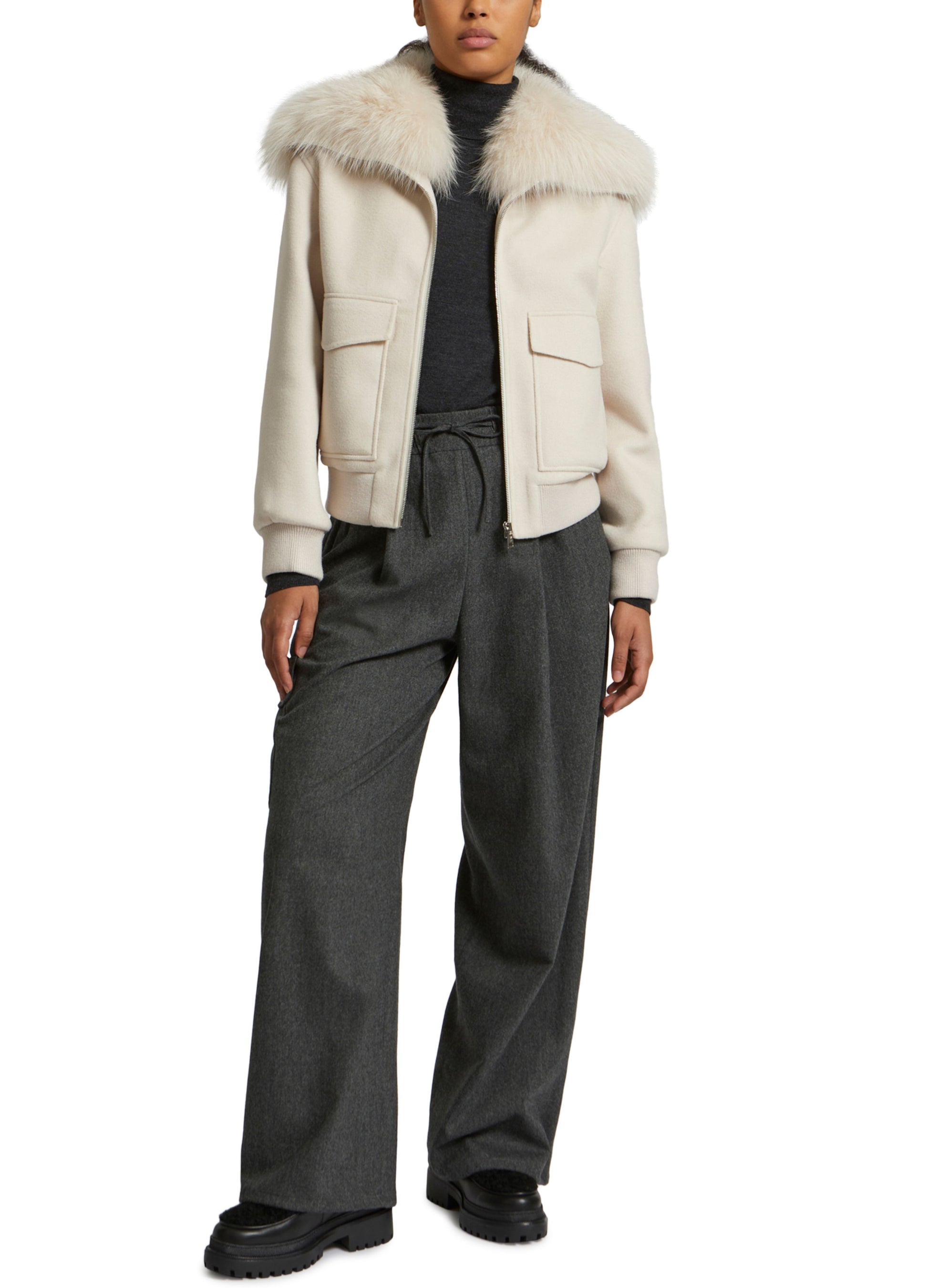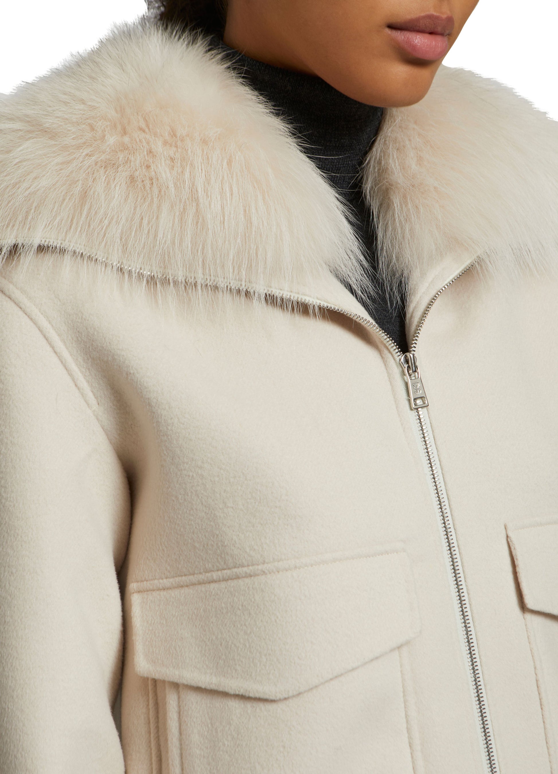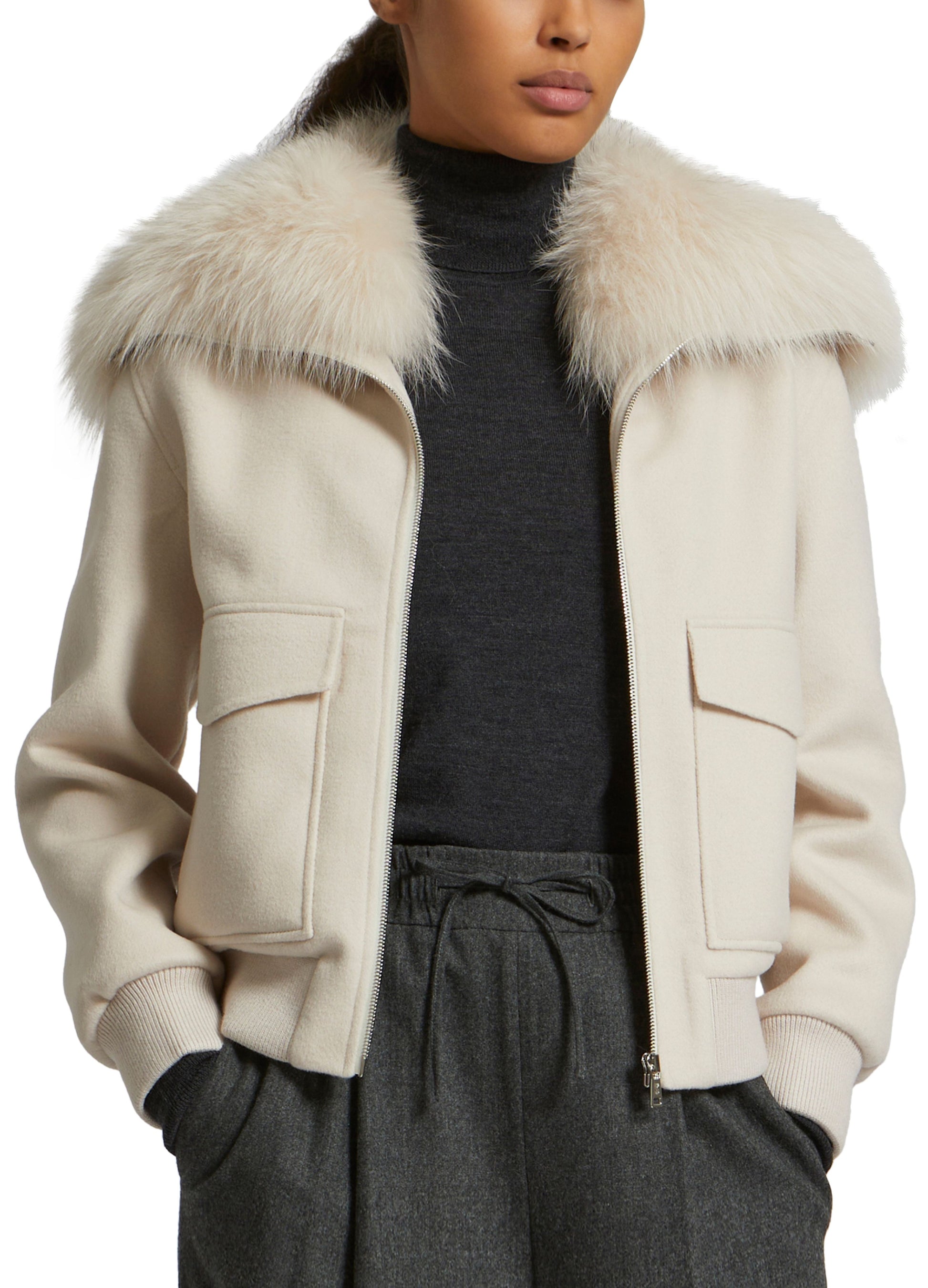 Crafted from silk-lined cashmere wool, this cropped jacket mixes styles and inspirations. Featuring two patch pockets with flap, ribbed finishes and a contrast zip fastening with a branded slider, this model plays with the sportswear and utility codes. The removable fox fur collar adds an elegant touch and fits perfectly to the jacket thanks to a concealed button system. A versatile piece to suit every mood and create a resolutely modern look.