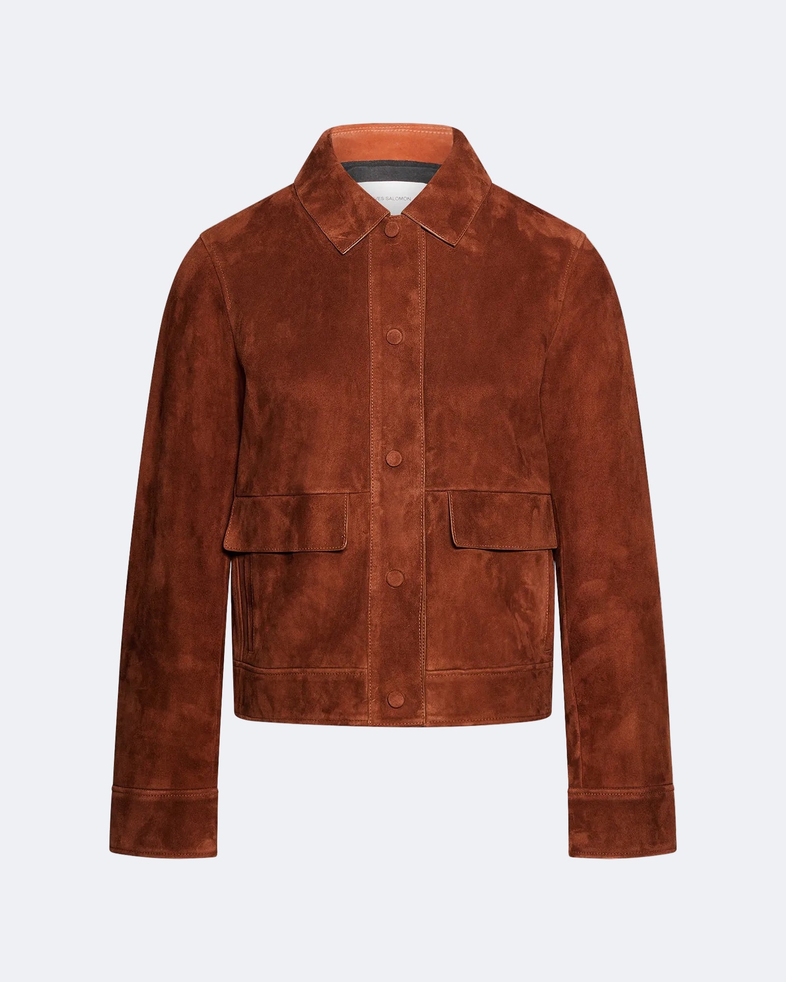 The velvety feel of a suede-effect double-sided lambskin brings a touch of sophistication to this short jacket with pared-down lines, with a shirt collar and matching leather-covered press studs.