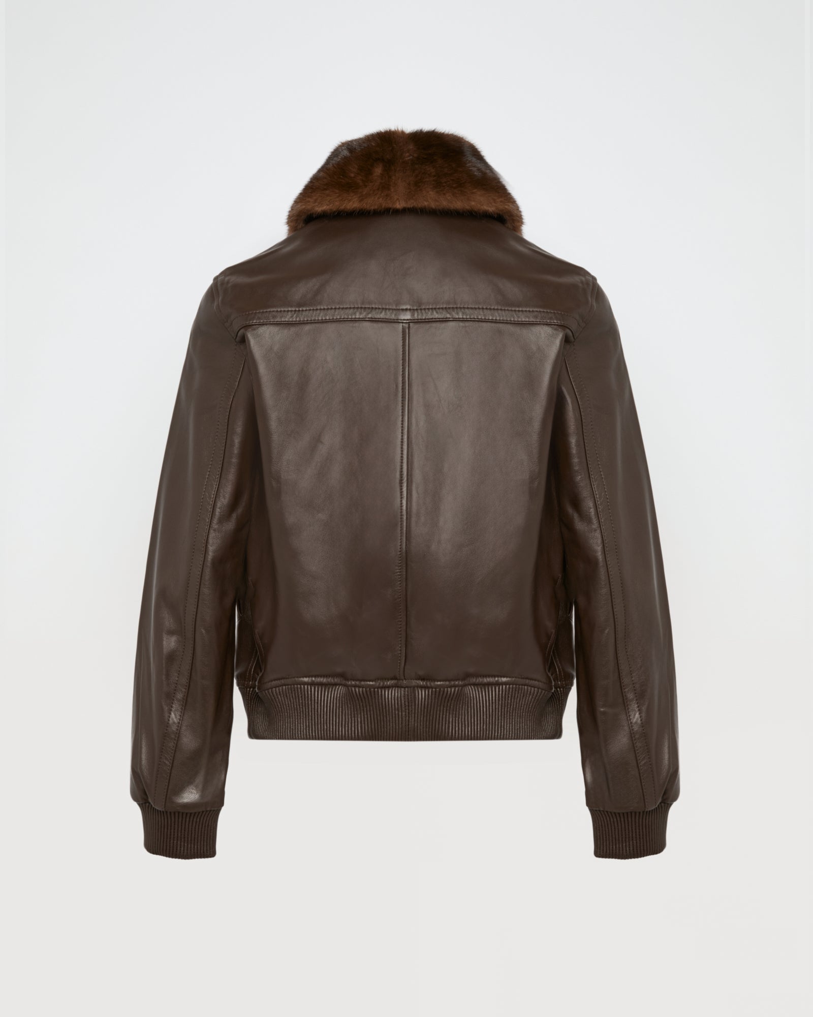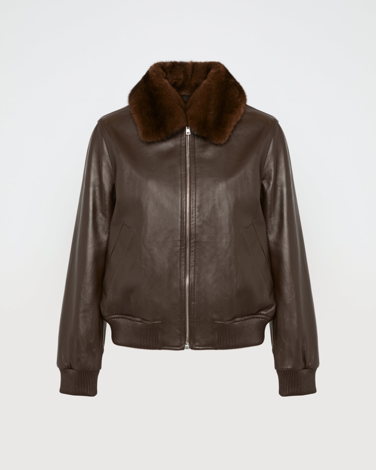 A retro feel for this zipped bomber jacket in smooth lambskin. A detachable collar in soft yet resistant mink fur provides elegance and versatility.