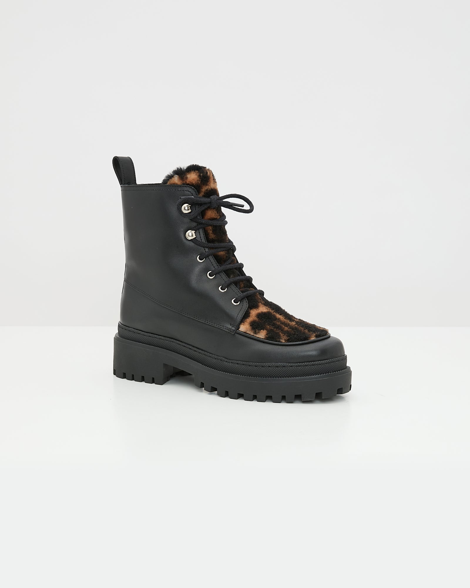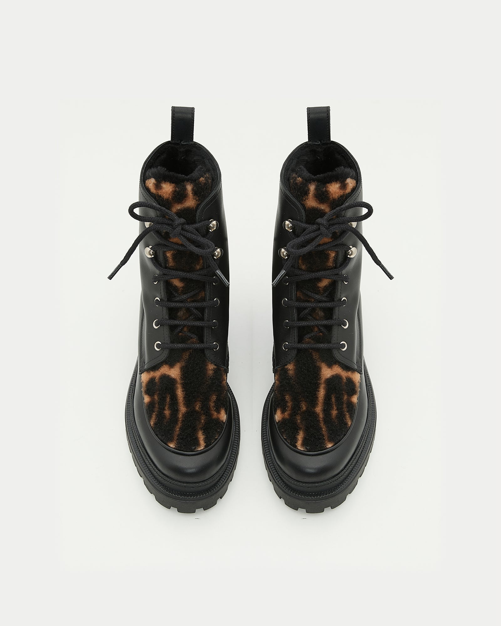 Style, comfort and warmth combined with these ankle-height lace-up boots, which play on the contrasting textures of leather and Lacon shearling. Thick rubber soles with treads allow for safe steps both in the city and in the mountains.