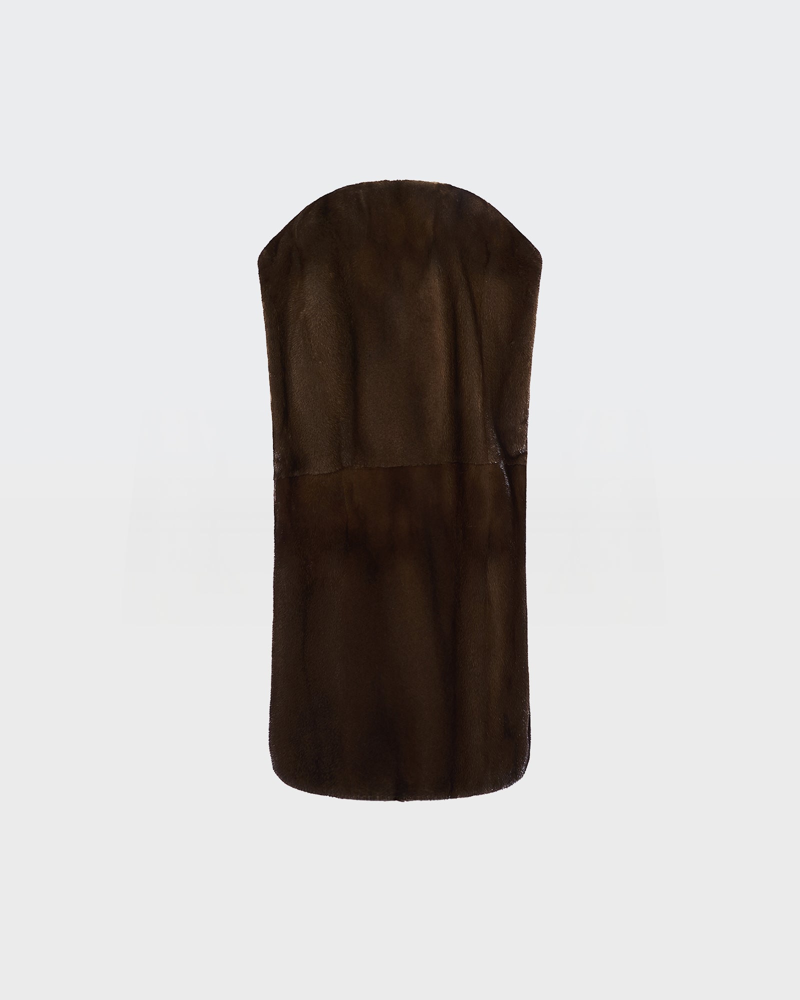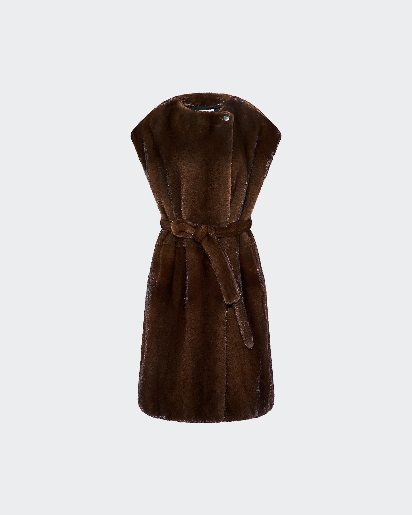 The luxurious texture of long-haired mink fur brings its unique feel to this slightly oversized cape, whose simple lines highlight the noble material. The cape can be worn open or closed thanks to invisible hooks and a button at the neck.