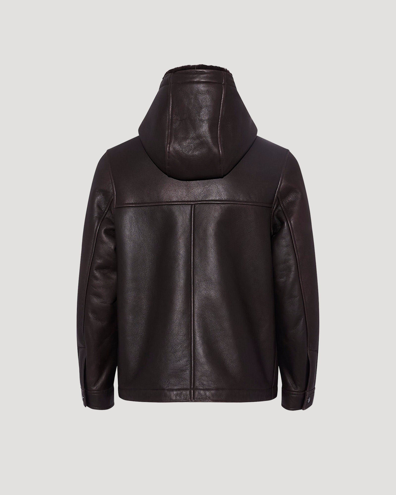 The classic hoodie shape worked in a generous Merino shearling, with a silky finish on the leather side. One outer chest pocket, inner logo pockets.