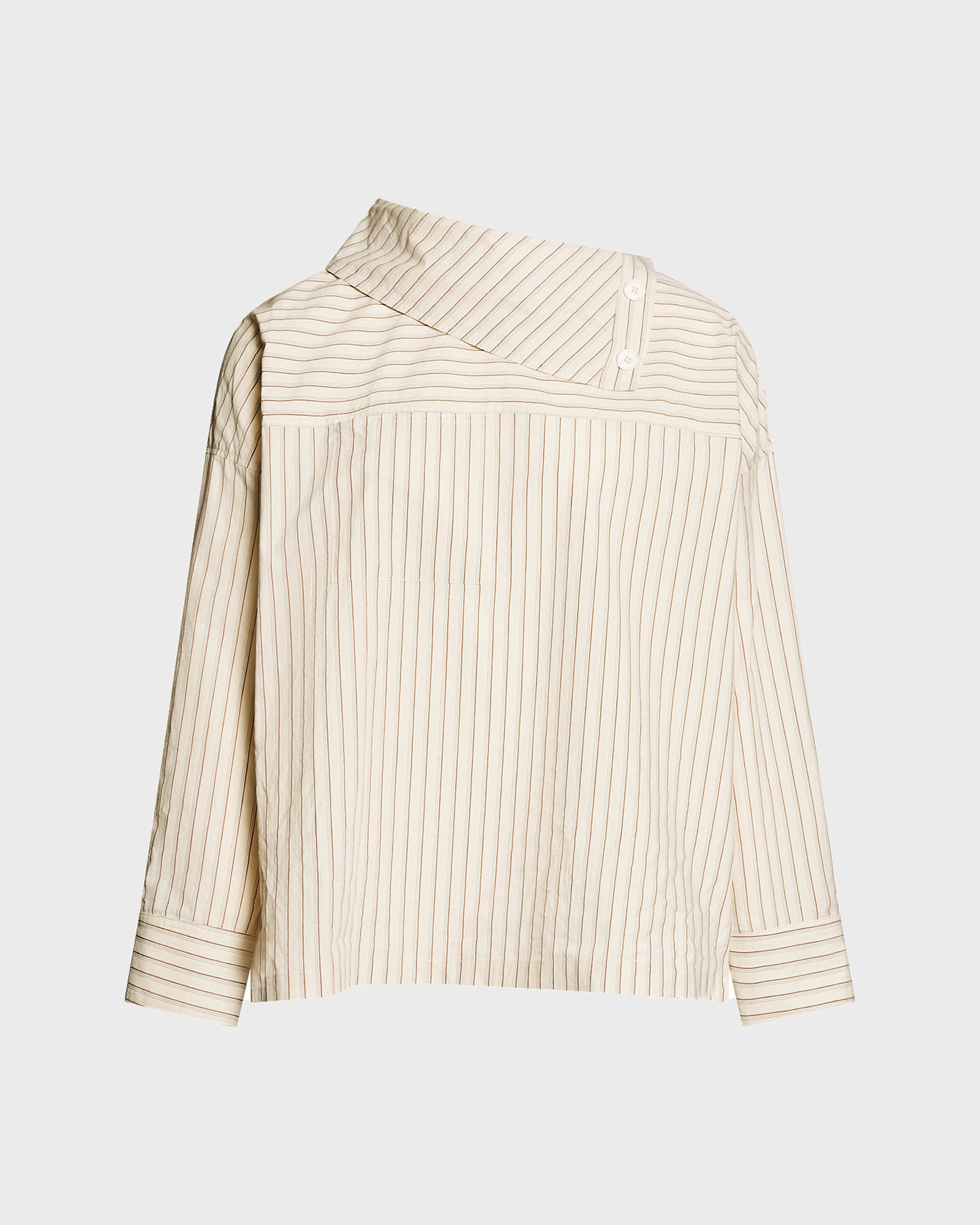 The crisp yet silky texture of poplin gives a unique feel to this blouse with a wide asymmetric collar, for an elegantly simple, versatile garment.