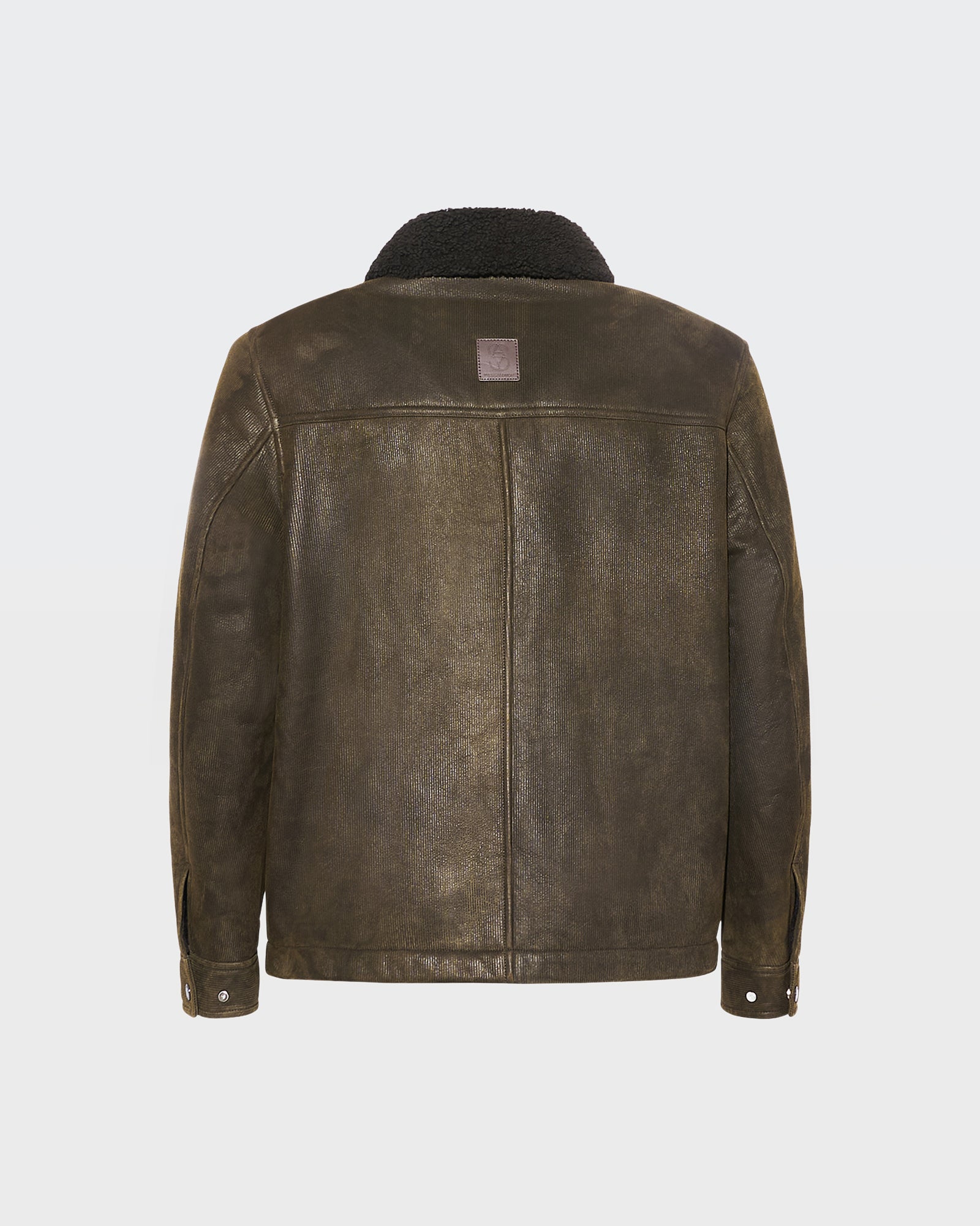 An aviator-inspired shape for this jacket in silky effet shearling, whose wool face can be seen at the collar. The outer nappa face is worked with a ribbed, corduroy effect. Two large pockets and a chest pocket at the front, one inner logo pocket, logo patch at the nape.