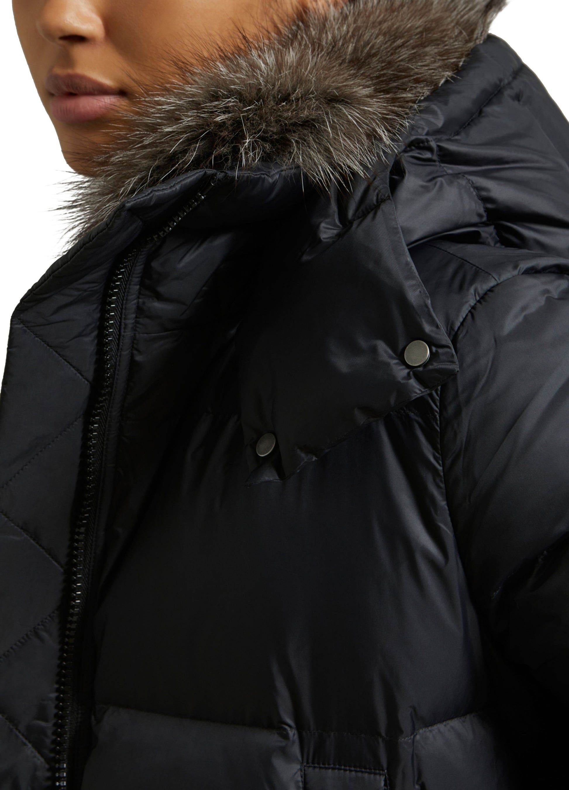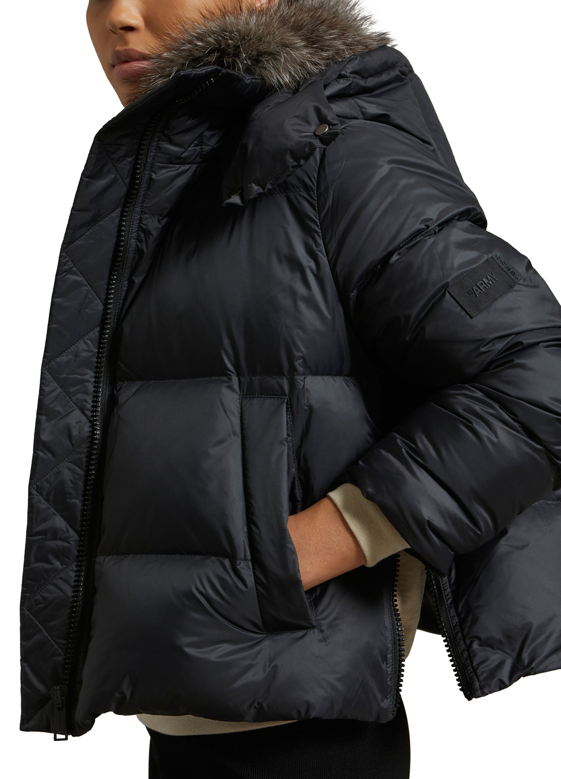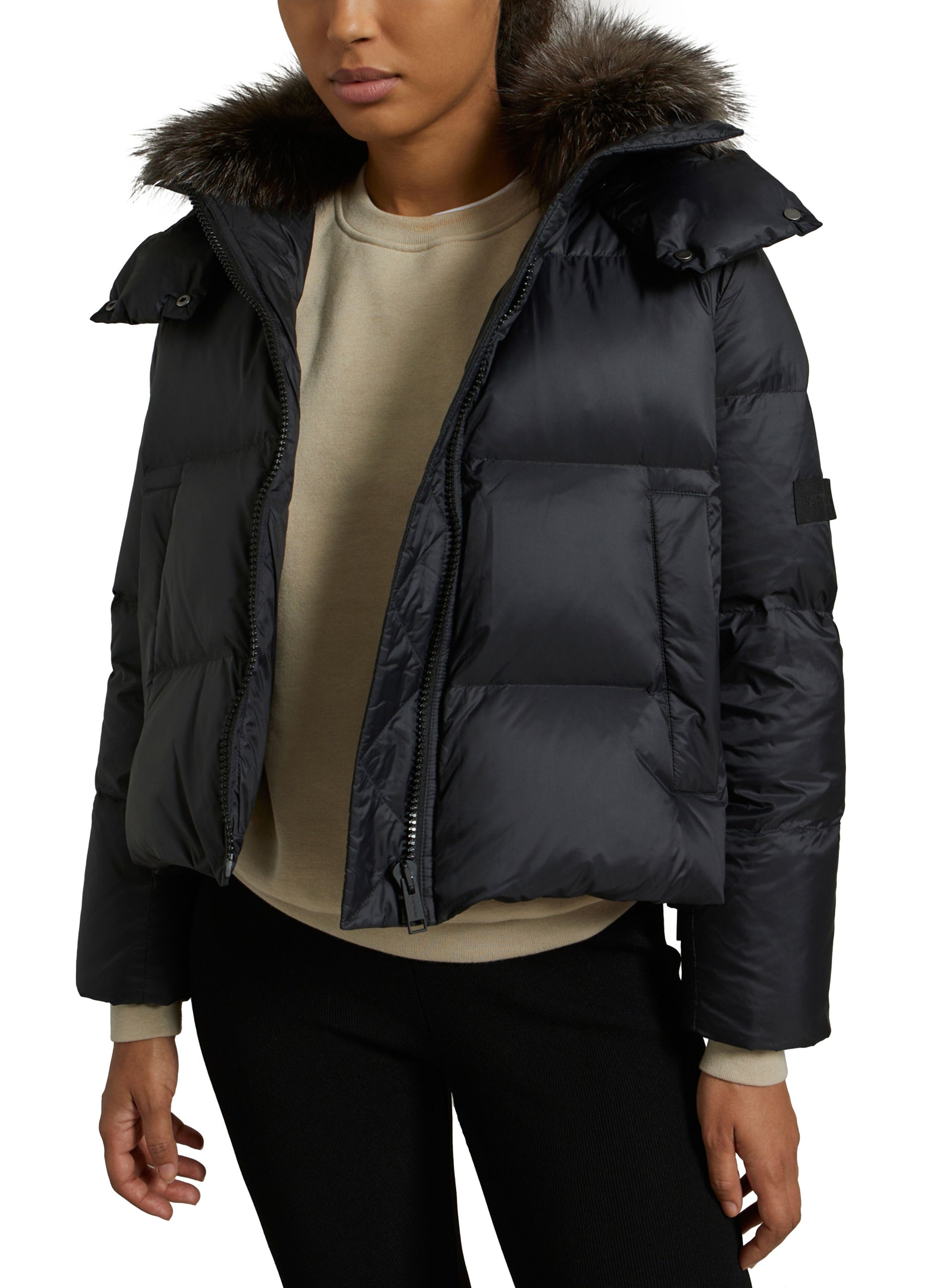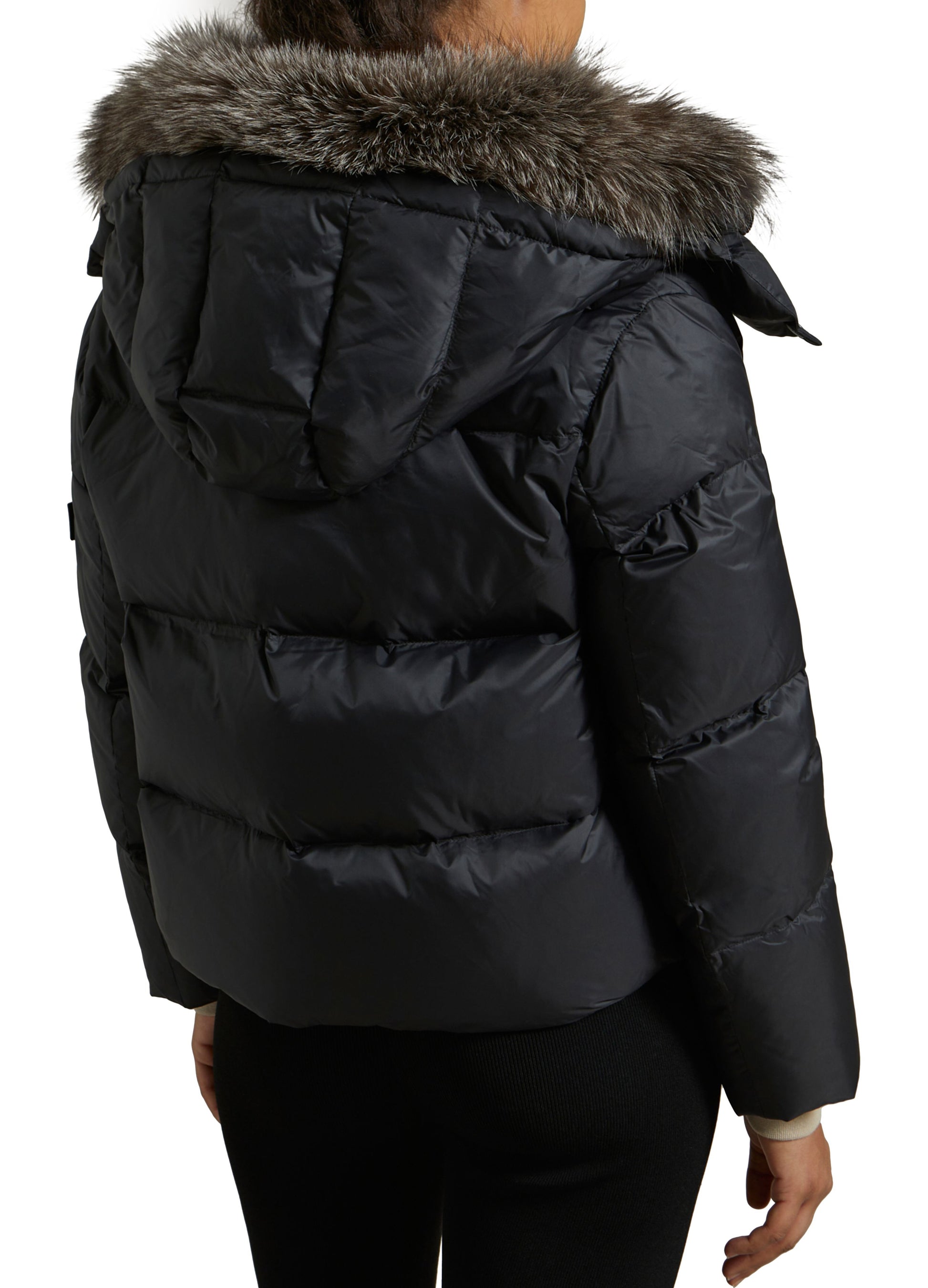 A timeless essential, the short down jacket in water-repellent technical fabric is revisited in a feminine and versatile version. Featuring a detachable hood and a removable collar trim in natural-dyed fox fur, its style evolves with the season. Design details include a front zip fastening, two welt pockets, invisible technical ribbed finishes at the bottom sleeves, as well as side zip slits. Functional and lightweight at the same time, this down jacket is padded with high-quality duck feathers and down to guarantee comfort, warmth and breathability all winter long.