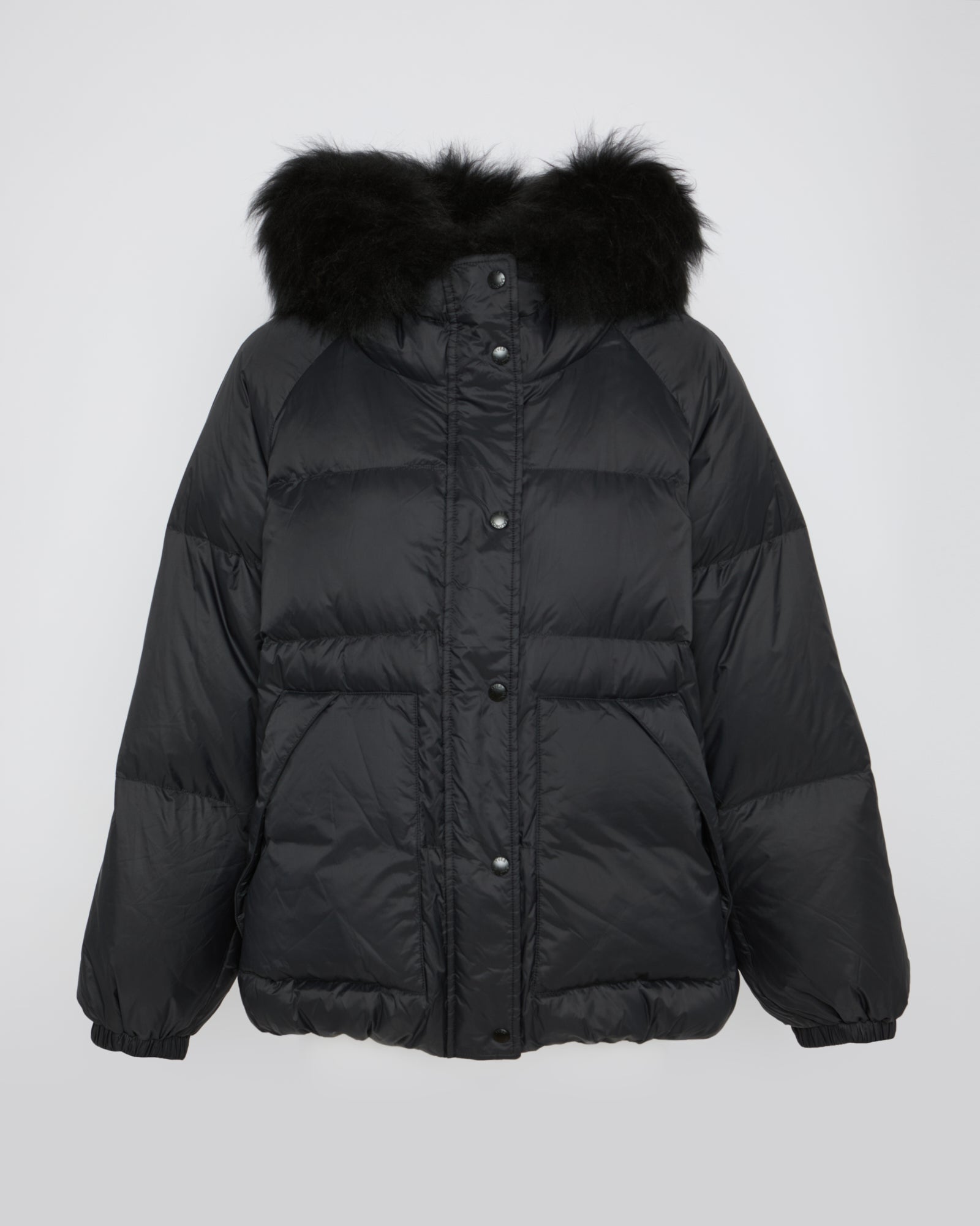 Short down jacket with raglan sleeves and fluffy lambswool trim