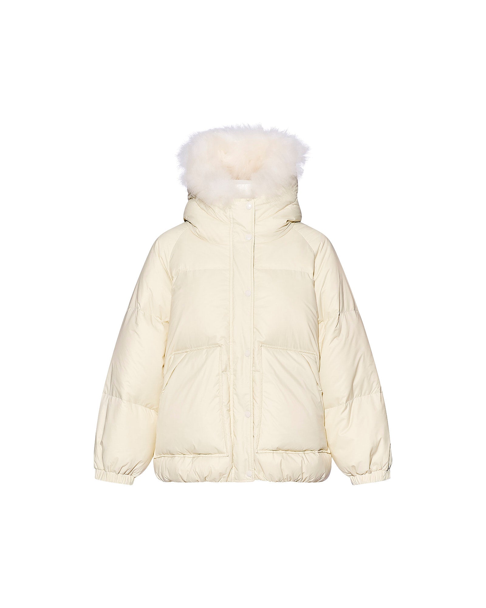 Short down jacket with raglan sleeves and fluffy lambswool trim