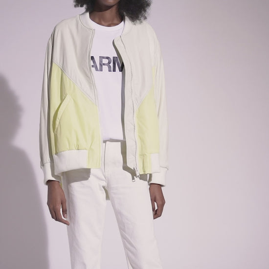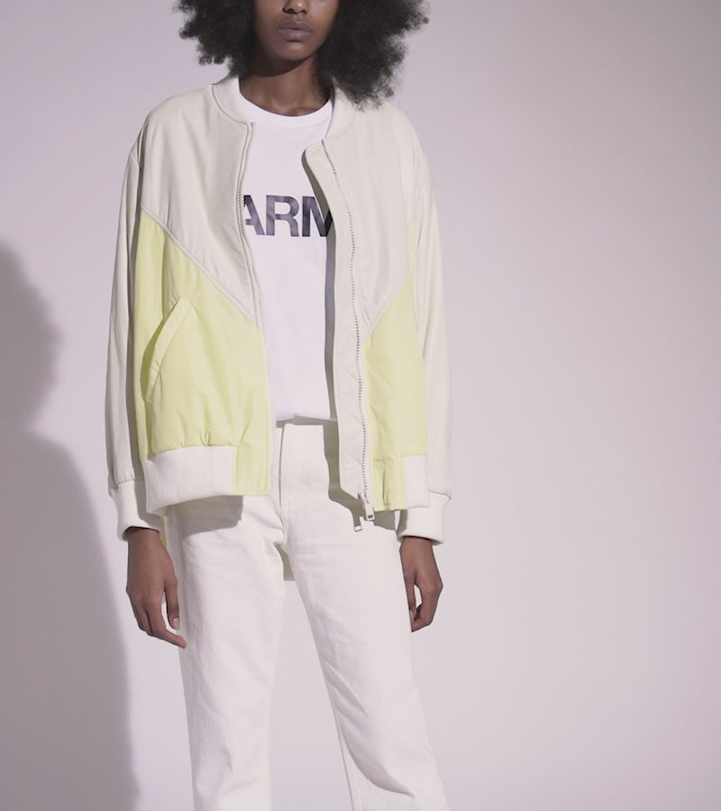This model fits true to size and has an oversized cut. Take one size down for a more fitted look. The model is wearing a size 36 and is 1.80 m tall.
