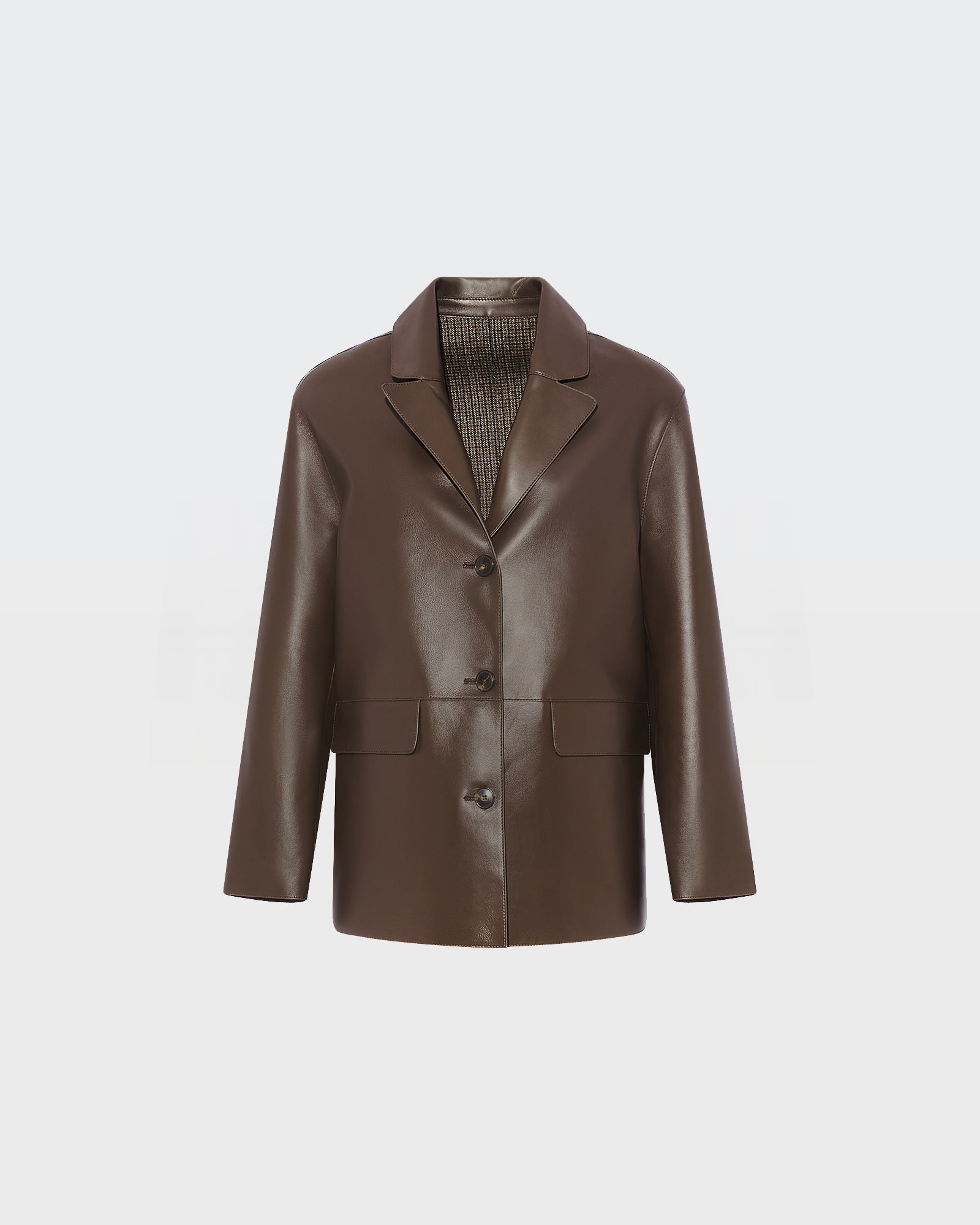Smooth, shiny lambskin has been bonded with houndstooth fabric to create this slightly oversized jacket, with a shape reminiscent of a workwear overshirt. The fabric technique allows for a lighter, more elegant feel. Two flat pockets, front button fastening.