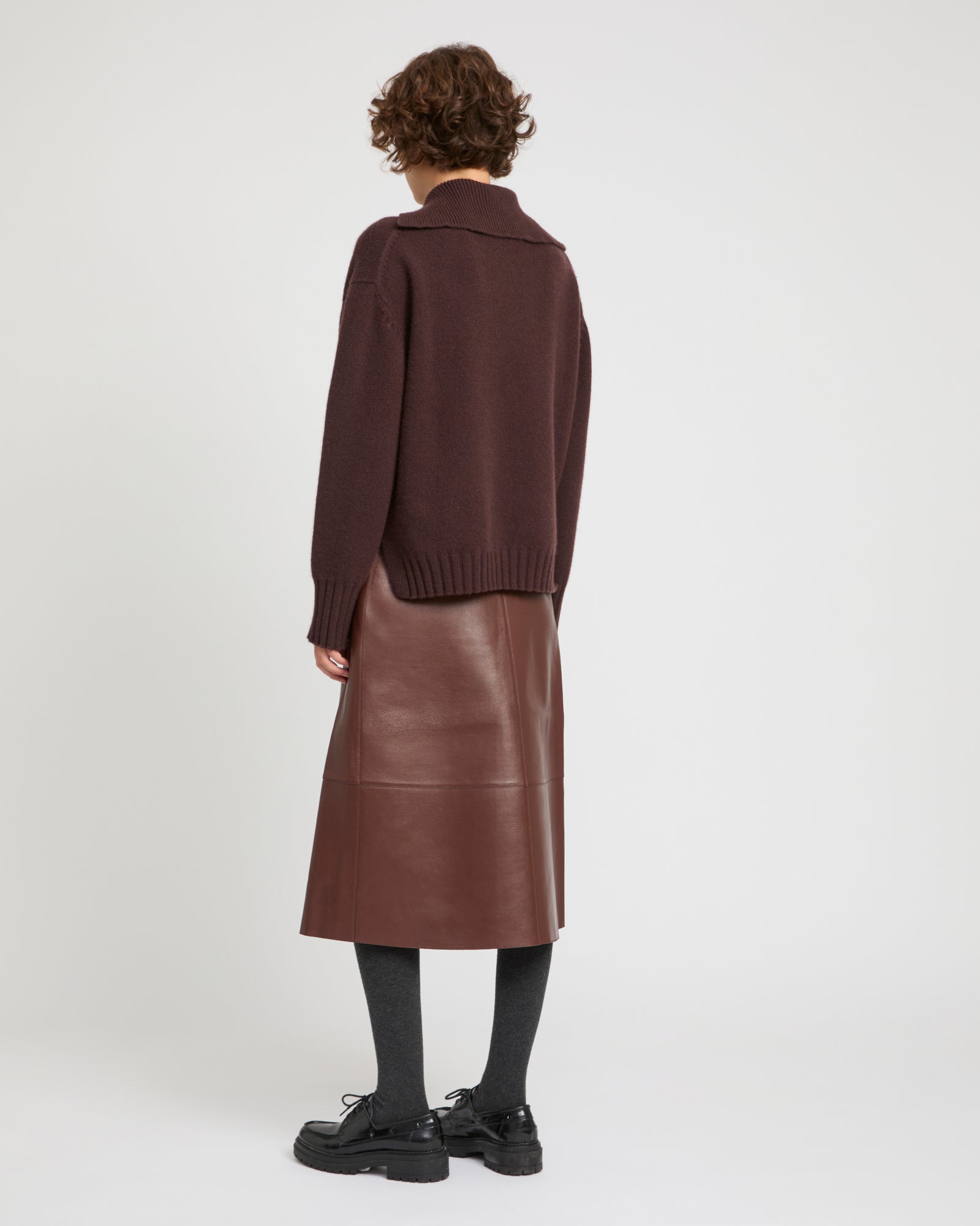 With its warp shape and elegant, clean lines, this skirt also features the versatility of a reversible, double-sided material. The skirt can be worn on either the smooth lambskin face, or on the houndstooth face, with a same waist-lebel button fastening. Mid-calf length