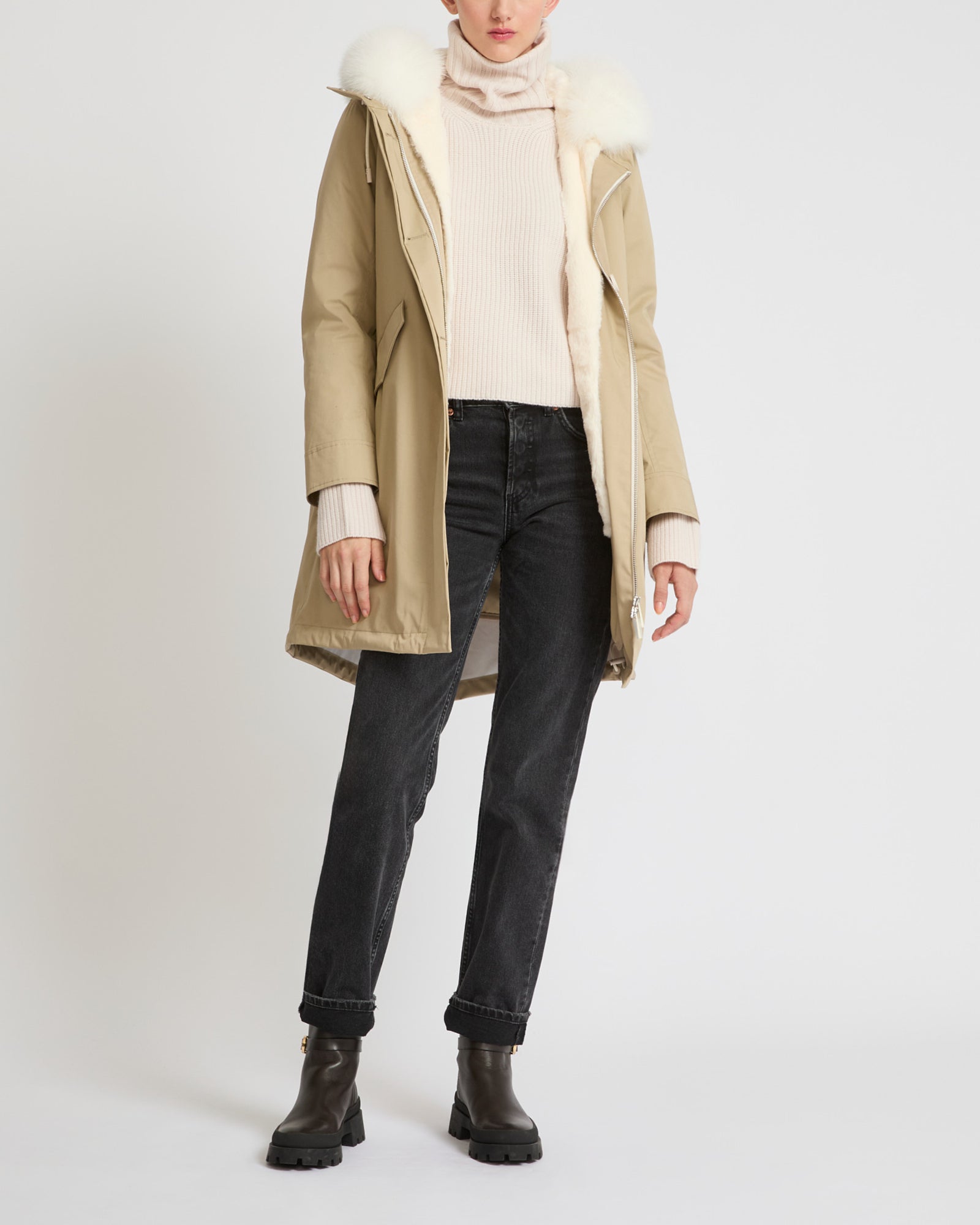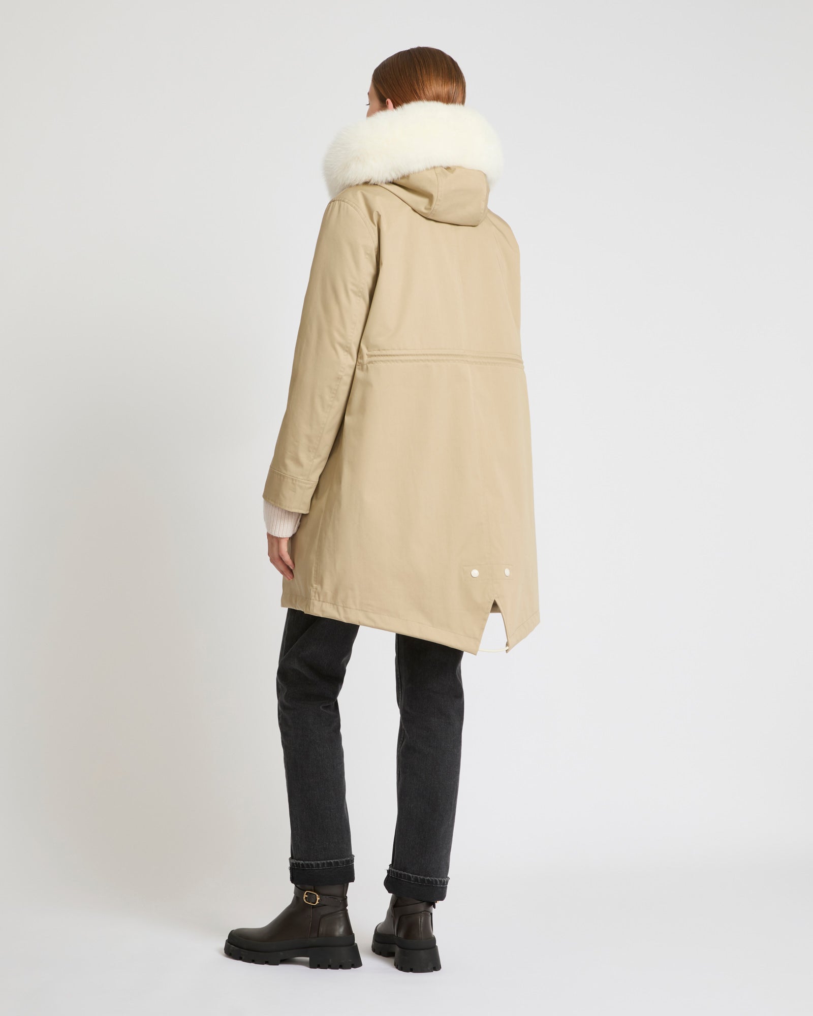 Crafted from a weather-resistant cotton blend, this regular parka has a flared cut and a pared back silhouette. Design details include a concealed zip and button fastening, two flap pockets, an inside pocket and a fishtail finish in the back. Drawstrings at the waist and bottom allow the fit to be adjusted for a more feminine and contemporary look. Warm and enveloping, this model has a detachable hood trim in fox fur, as well as a removable lining in sheared rabbit featuring padded sleeves filled with high-quality feathers and down, as well as ribbed finishes. Functional and timeless, this parka is versatile to match the season.